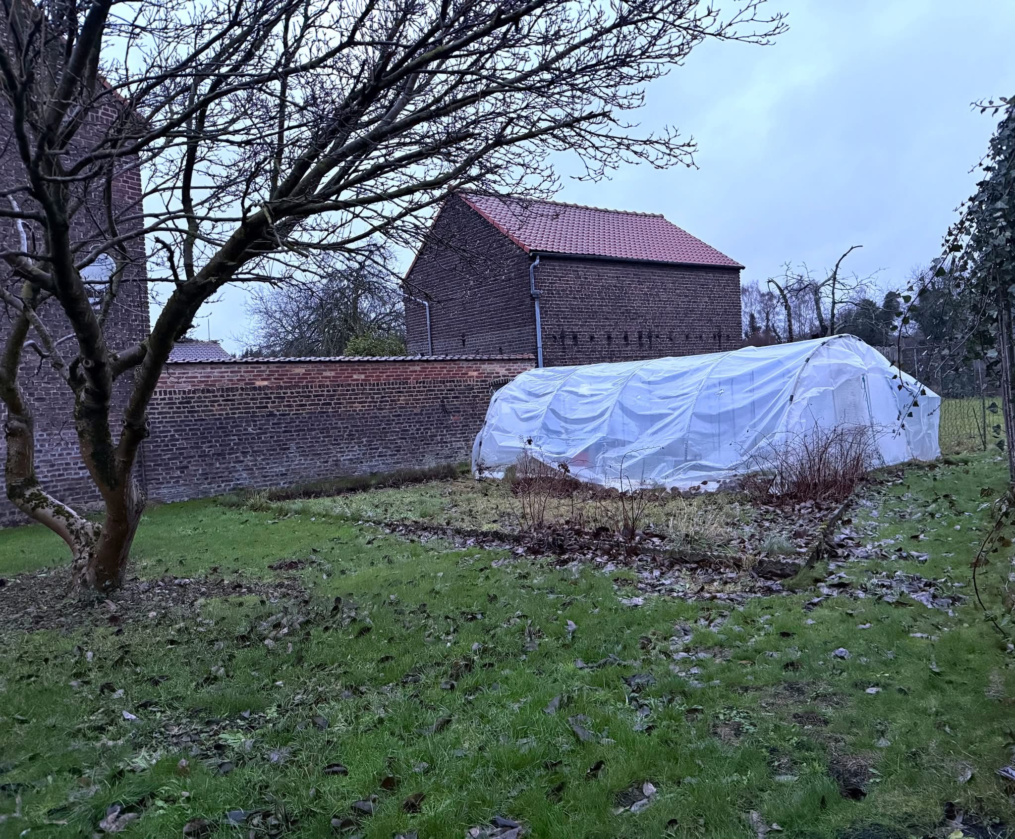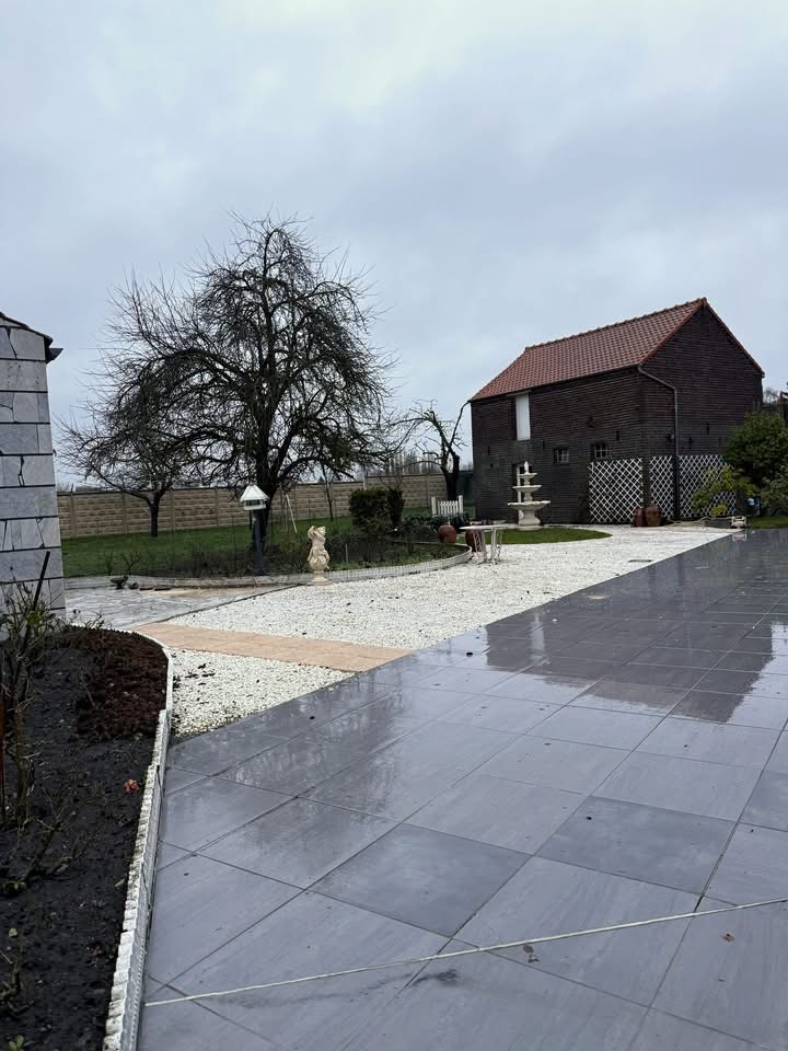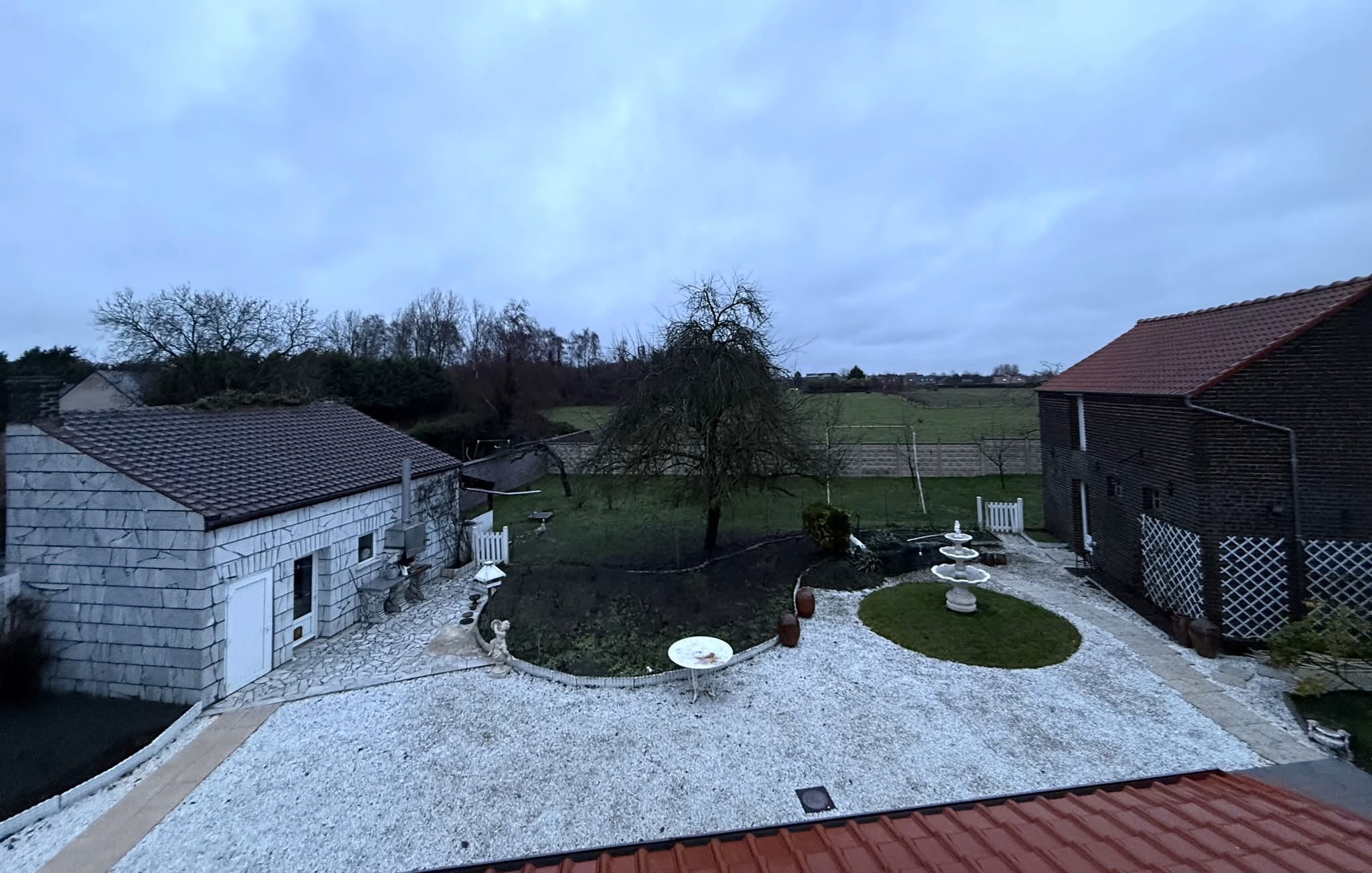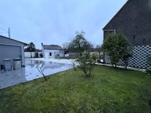 Maison individuelle bâtie sur 1482 m², avec passage sur le côté, grand garage (style hangar 🚍) et jardin clos.