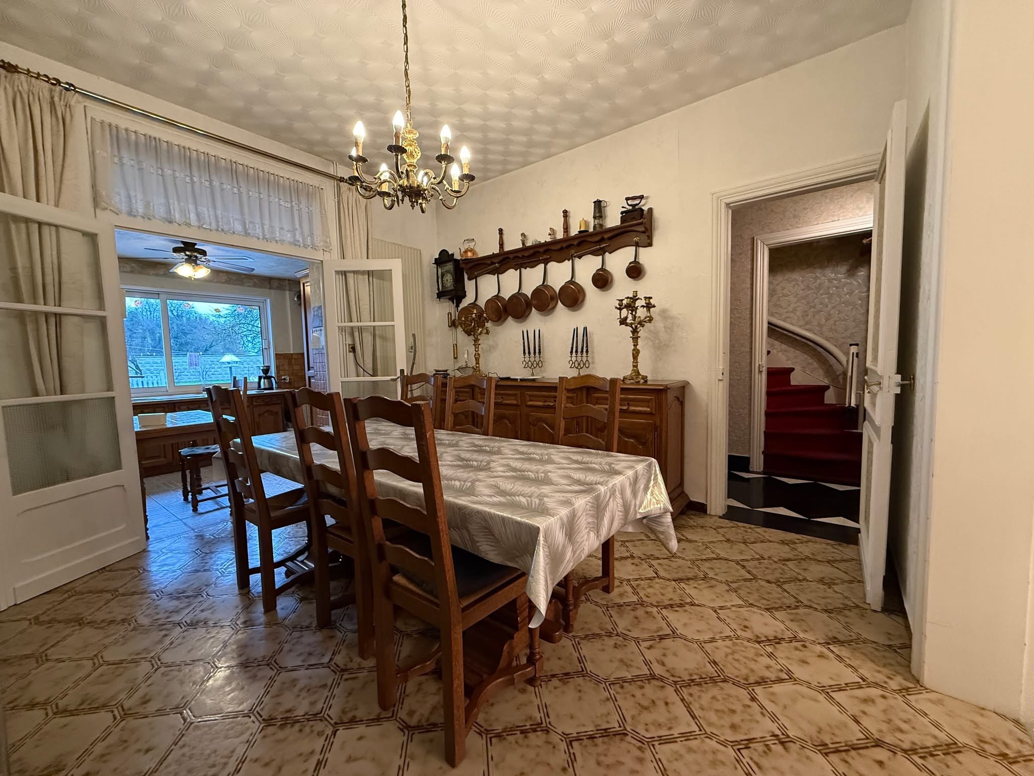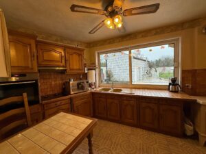 Vous trouverez au rez-de-chaussée, un couloir d’entrée, une pièce de vie, un salon, une salle à manger, une cuisine / véranda, une buanderie, une salle de bains et un WC séparé.